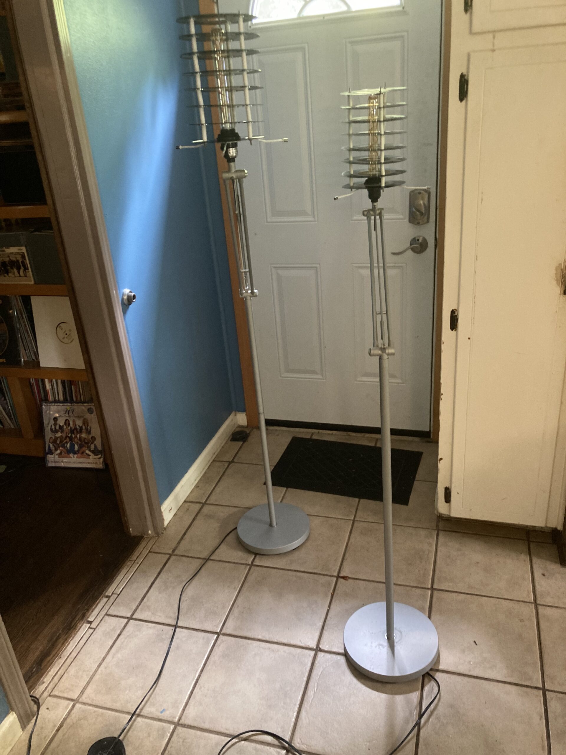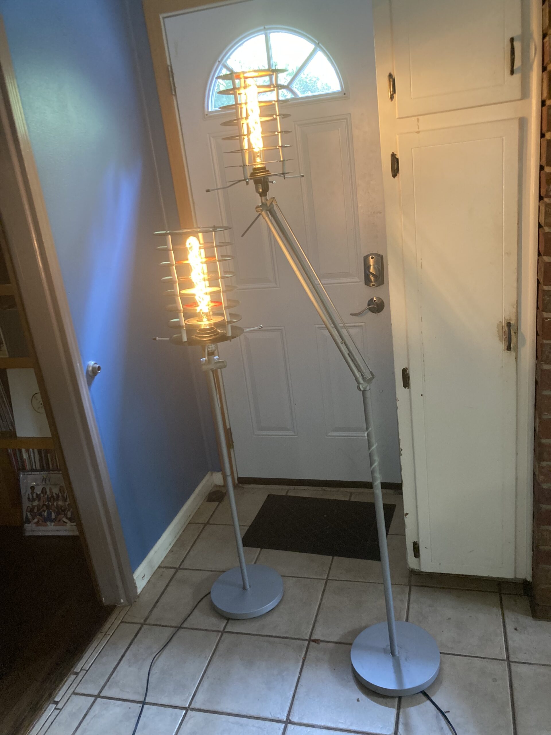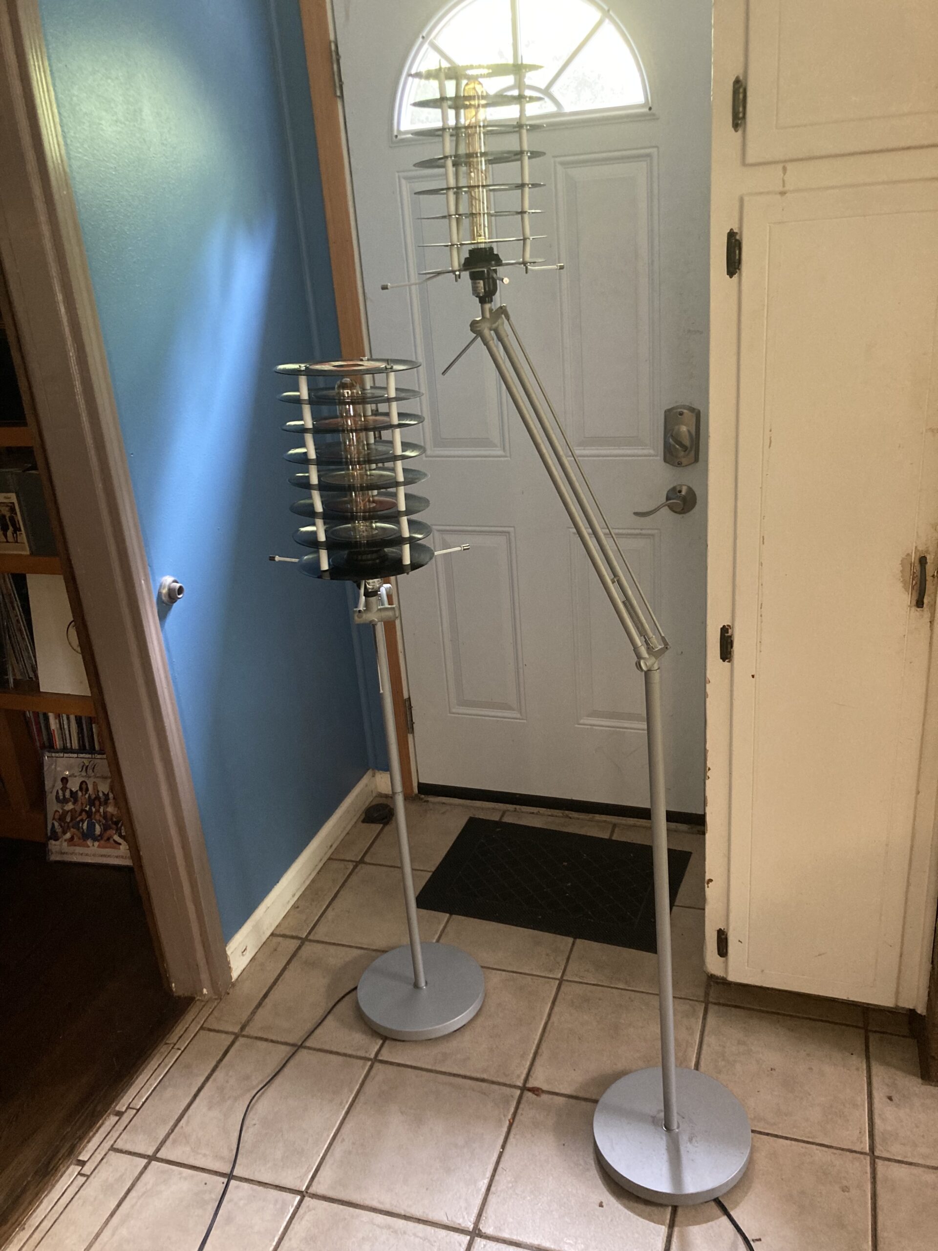 These lamps are built on IKEA swing lamps that I poached from my parents’ house. They match, using 8 45s each. I would be willing to finish the bases using some lacquered record sleeves, on discussion. Prefer to sell them as a pair, but I will do them individually.